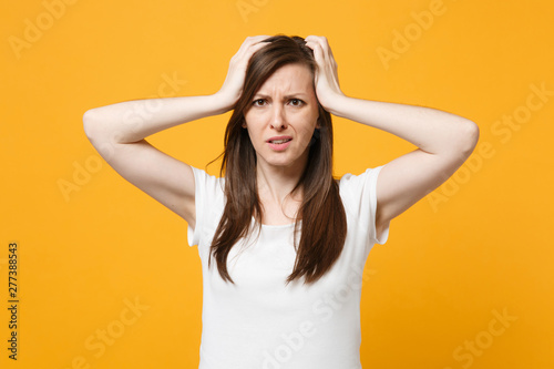 Portrait of preoccupied young woman in white casual clothes looking camera, putting hands on head isolated on yellow orange wall background in studio. People lifestyle concept. Mock up copy space.