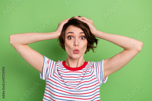 Portrait of pretty amazed girlish girl sudden good news reaction isolated over green pastel color background