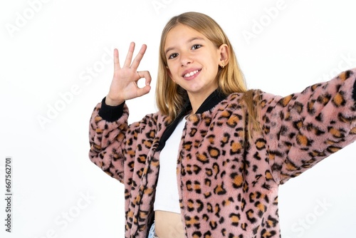 Portrait of pretty cheerful Beautiful caucasian teen girl make selfie show okey symbol