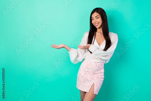Portrait of pretty cheerful filipino person hands palms demonstrate empty space isolated on aquamarine color background