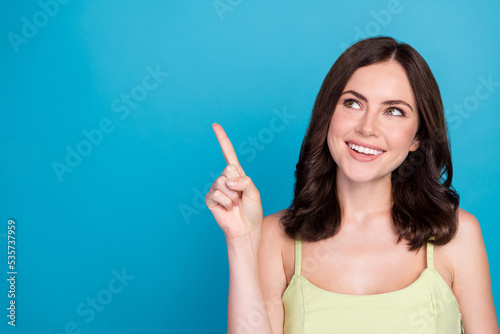 Portrait of pretty cheerful lady beaming smile look direct finger empty space isolated on blue color background