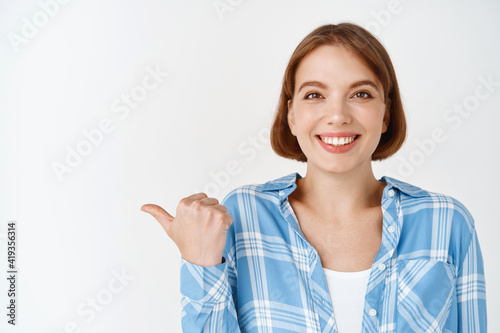Portrait of pretty female student with white teeth and natural make-up, pointing thumb left and smiling, showing logo brand, standing on white background