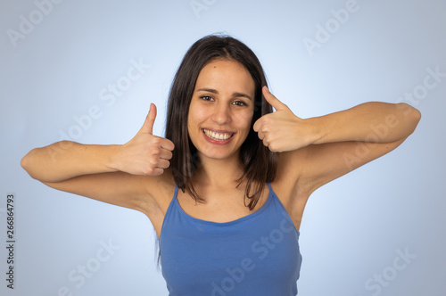Portrait of pretty teenager making thumbs up gestures feeling happy and successful