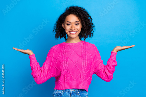 Portrait of pretty young lady hold empty space vs wear pink pullover isolated on blue color background