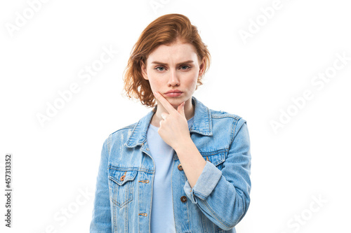Portrait of red haired dreamy lovely lady, youth. Redhead woman in blue jeans displeased thinks, chooses, decides, dilemmas, isolated white background. Girl student is unhappy