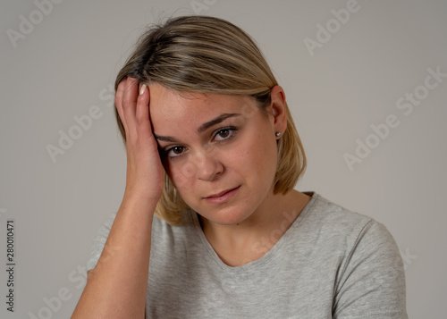 Portrait of sad depressed woman having headache and emotional pain. In Health and Human expressions