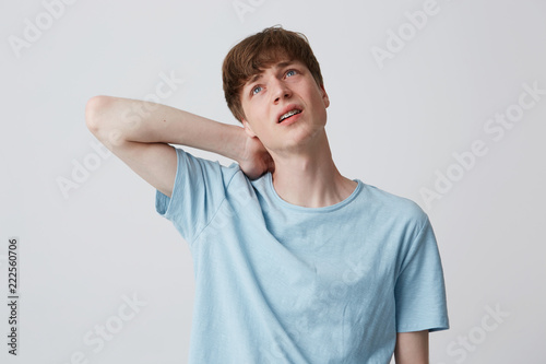 Portrait of sad desperate young man with braces on teeth wears blue t shirt feels tired and suffering from neck pain isolated over white background