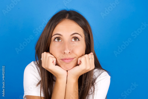 Portrait of sad young european girl wearing white t-shirt on white background hands face look empty space