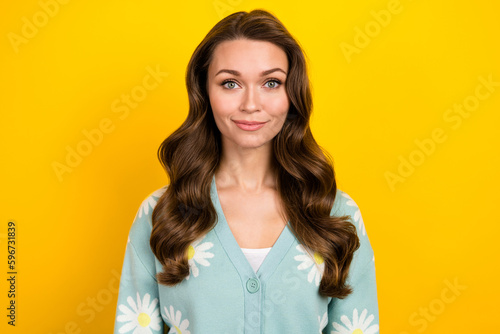 Portrait of satisfied friendly young lady nice wavy hairdress smile look camera isolated on yellow color background