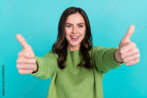Portrait of satisfied nice lady toothy smile two arms show thumb up isolated on teal color background