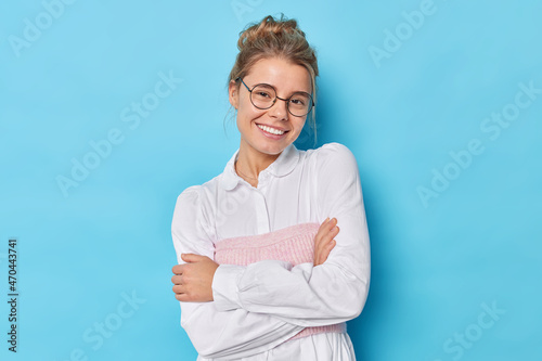 Portrait of satisfied woman with glad expression keeps arms folded has self confident look wears round spectacles white shirt isolated over blue wall. Happy female student discusses interesting topic