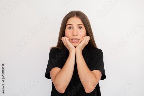 Portrait of scared young woman looking at camera over white background. Caucasian lady wearing black T-shirt touching face with worried expression. Anxiety concept