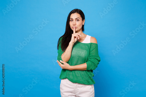 Portrait of secret young woman in green casual clothes saying hush be quiet with finger on lips shhh gesture isolated on blue wall background in studio. People lifestyle concept. Mock up copy space.