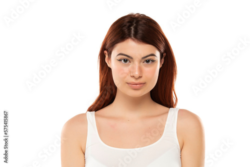 Portrait of serious beautiful woman with long straight ginger hair on a white background