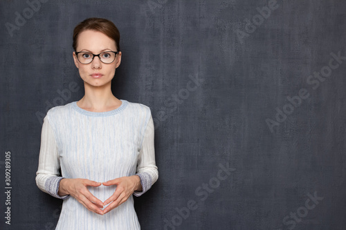 Portrait of serious focused girl holding hands folded together
