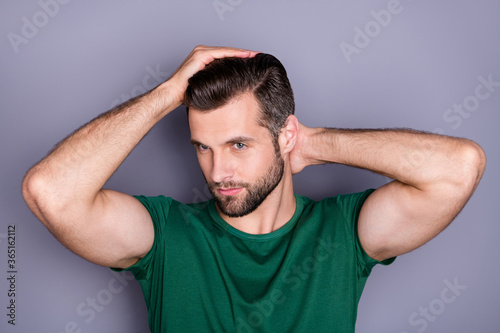 Portrait of serious macho charismatic guy look in mirror look good touch head hand hairstyle like haircare procedure wear green t-shirt isolated over gray color background