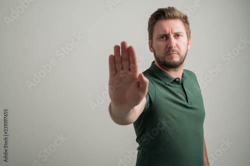 Portrait of serious stylish attractive man with thick beard, dressed in casual green t shirt showing stop gesture