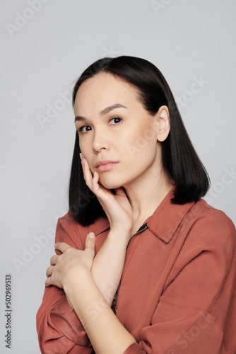 Portrait of serious young Asian woman with natural makeup touching own face against white background