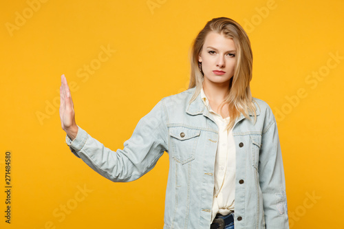 Portrait of serious young woman in denim casual clothes looking camera, showing stop gesture aside with palm isolated on yellow orange wall background. People lifestyle concept. Mock up copy space.