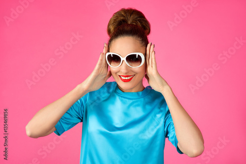 portrait of shocked and surprized young beautiful woman in blue silk dress and white sunglasses ot the pink background