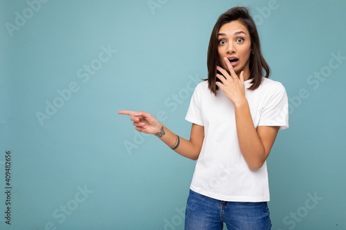 Portrait of shocked astonished young pretty nice winsome brunette woman with sincere emotions wearing casual white t-shirt for mockup isolated over blue background with copy space and pointing at