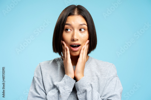 Portrait of shocked attractive Asian woman with stylish hairstyle looking away choosing something