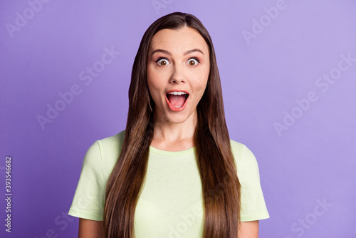 Portrait of shocked person staring open mouth promotion wear light green isolated on purple color background