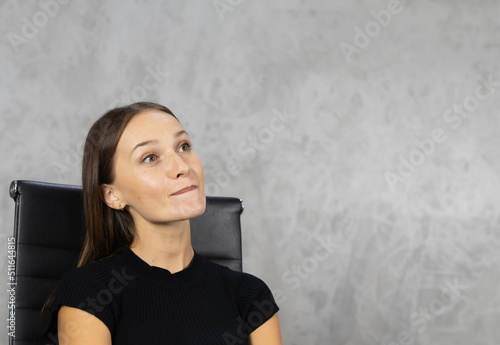 portrait of smart woman relax, happy smile, and looks at copy space. pretty caucasian woman relax working business at home office