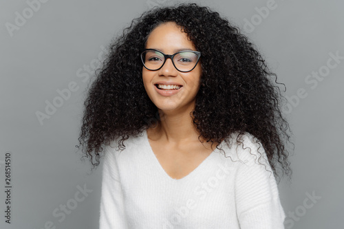 Portrait of smiling African American woman wears transparent eyewear and white jumper, being in high spirit, expresses good emotions, isolated over grey background. People and ethnicity concept
