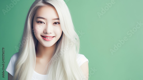 Portrait of smiling asian teenager girl with long and white hair creamy green background.