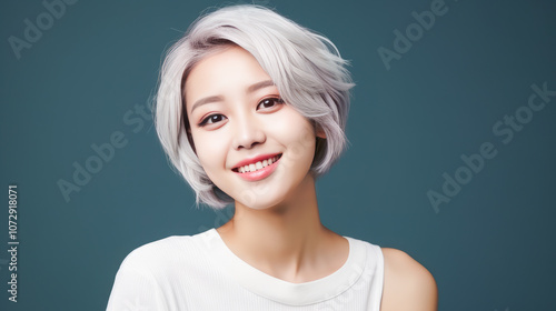 Portrait of smiling asian teenager girl with short haircut and white hair purple background.