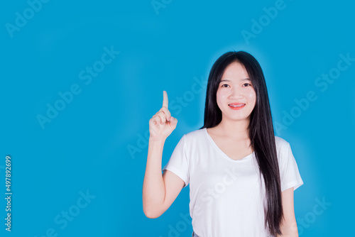 Portrait of smiling asian woman pointing finger to the side on blue background