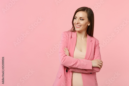Portrait of smiling attractive young woman in jacket looking aside, holding hands folded isolated on pastel pink background in studio. People sincere emotions, lifestyle concept. Mock up copy space.