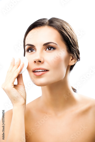 Portrait of smiling beautiful young woman cleaning skin by cotton pad, looking up, isolated over white background
