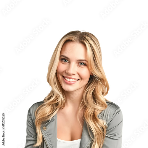 Portrait of smiling blonde woman with gray jacket isolated on transparent background