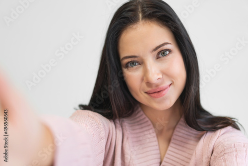 Portrait of smiling cheerful beautiful pretty asian woman clean fresh healthy white skin posing smile look at camera making live selfie on smartphone on the bed at home