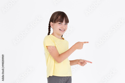 Portrait of smiling cute little kid girl pointing index finger up on mock up copy space for advertisement, posing isolated over white background wall in studio. Childhood lifestyle concept