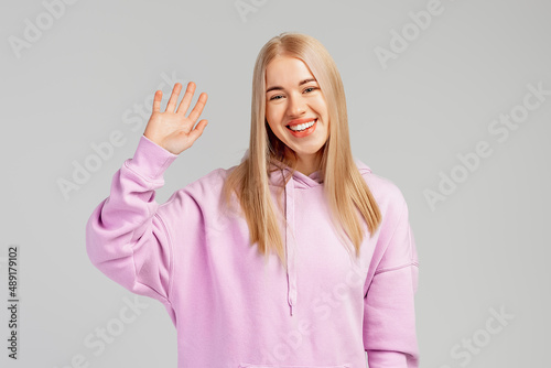 Portrait of smiling happy girl waving friendly, saying hello, greeting, hi gesture, standing in violet hoodie over gray background