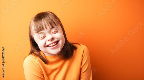 Portrait of smiling laughing teenage girl with Down syndrome orange background.
