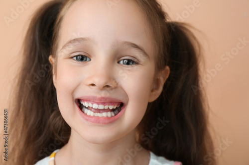 Portrait of smiling little girl with ponytails on beige background, closeup