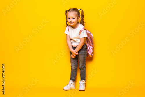 Portrait of smiling little schoolgirl with backpack on yellow background