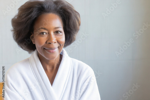 Portrait of smiling mature woman in bathrobe looking at camera in spa