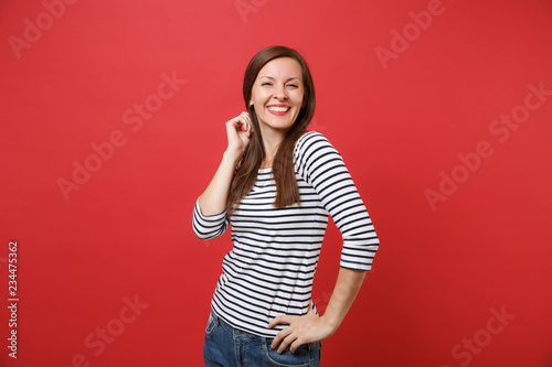 Portrait of smiling pretty young woman in casual striped clothes standing keeping hand near head isolated on bright red wall background. People sincere emotions, lifestyle concept. Mock up copy space.