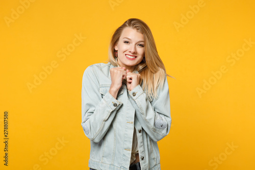 Portrait of smiling pretty young woman in denim casual clothes looking camera, clenching fists isolated on bright yellow orange background wall in studio. People lifestyle concept. Mock up copy space.
