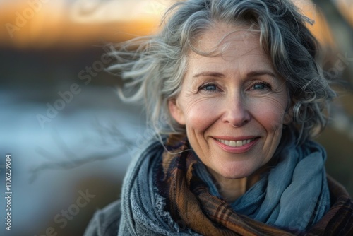 Portrait of smiling senior woman with gray hair blowing in wind at sunset