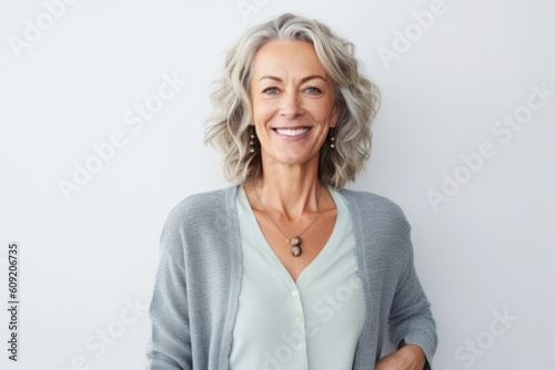 Portrait of smiling senior woman with grey hair looking at camera against white background
