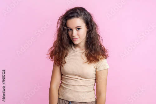 Portrait of smiling teenage girl with wavy tousled hair in beige T- shirt standing looking at camera with pleasant smile. Indoor studio shot isolated on pink background.