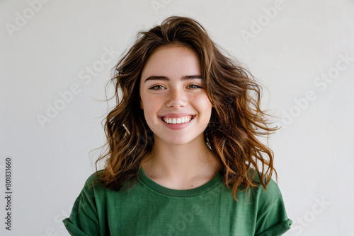 portrait of smiling woman with brown hair, wearing a green tshirt on a white background, looking at the camera in a half body shot