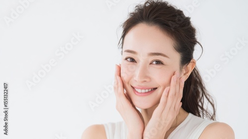 Portrait of smiling woman with radiant skin touching cheeks against clean white background perfect for skincare ads, beauty products and personal wellness content