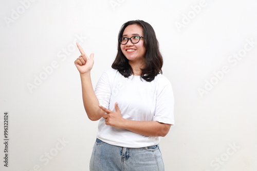 Portrait of smiling young casual lady, asian woman pointing fingers left, showing client info, chart of banner aside on copy space, white background
